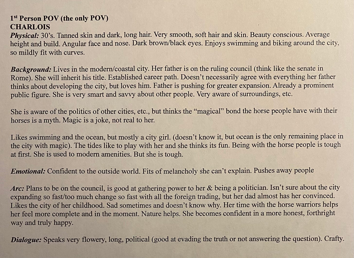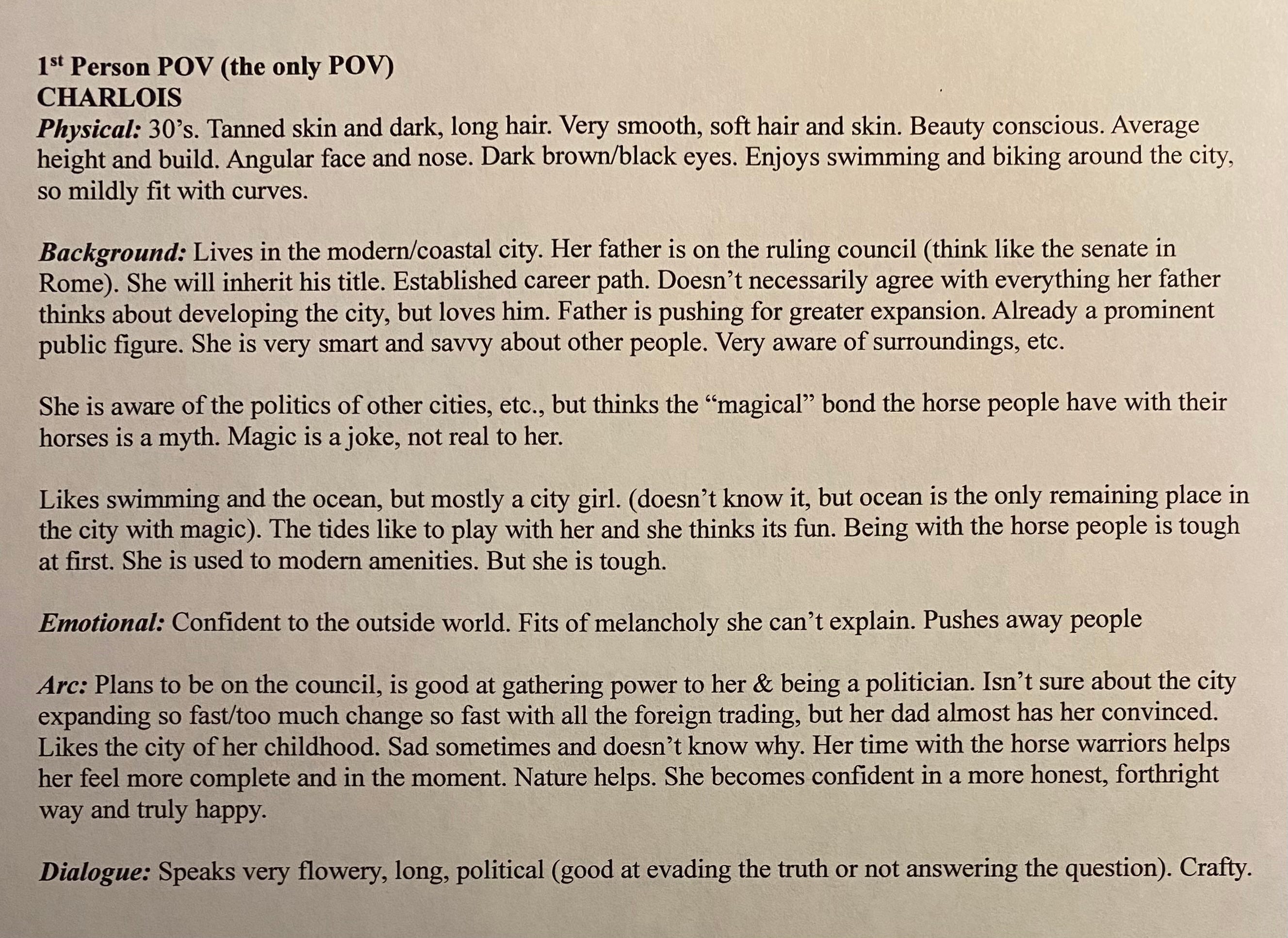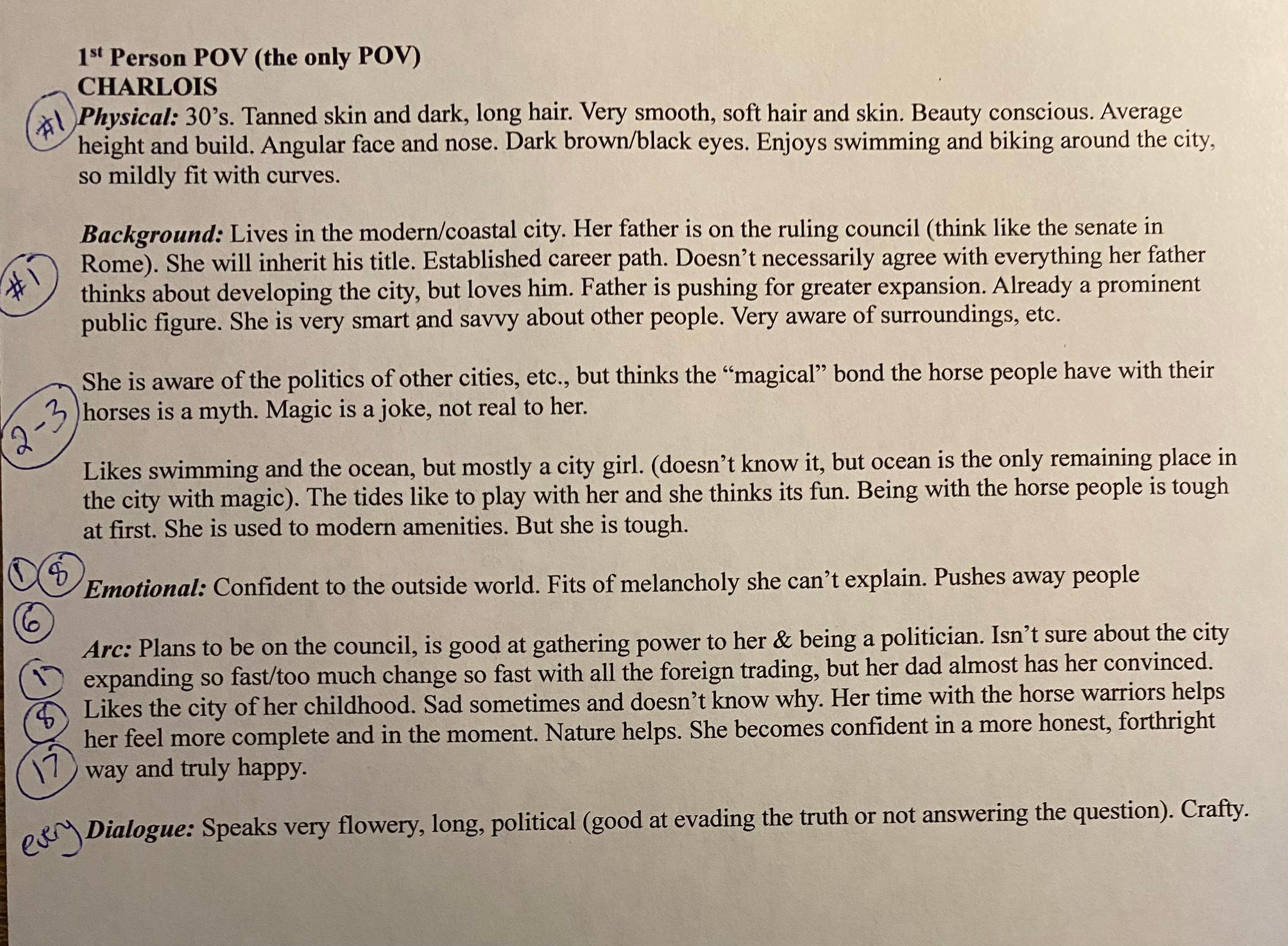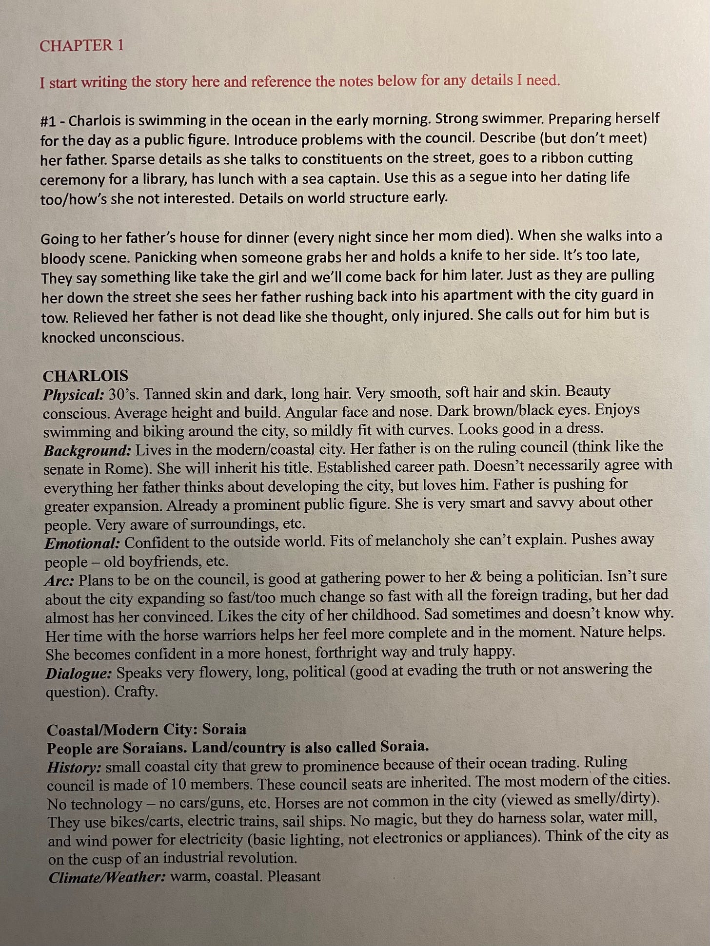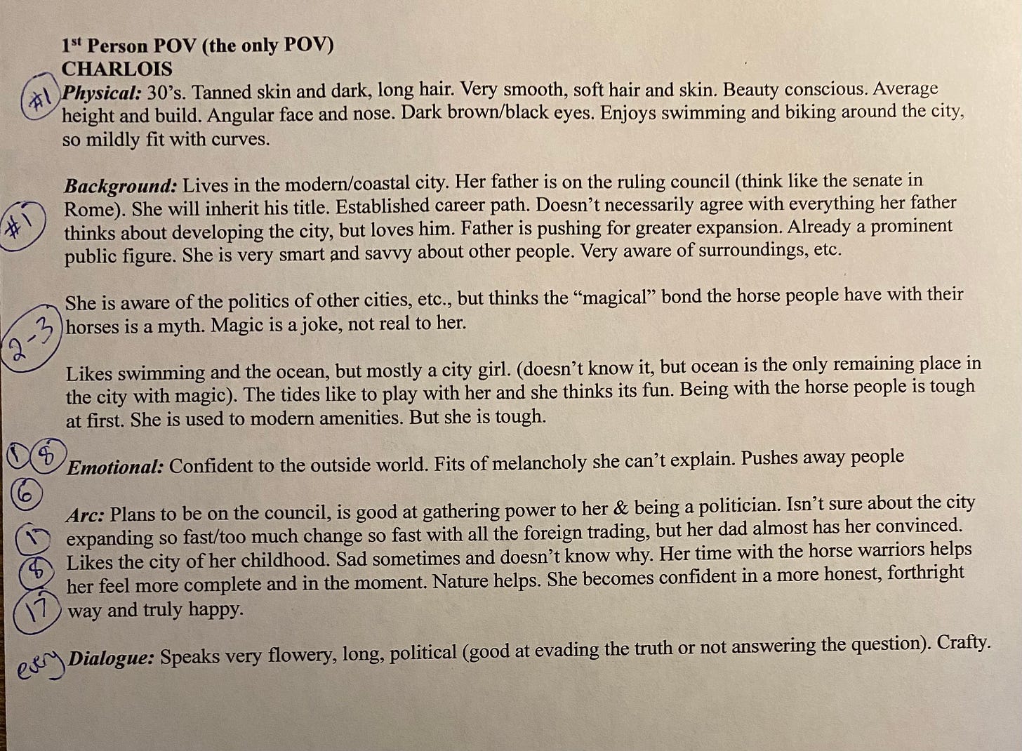 5. My favorite part is then mapping out the characters. For each main character, I make a sheet that details their physical details, background, emotions, general arc of their development throughout the story, and how they speak. Secondary characters are all on one sheet, with each character getting about a paragraph with any of the above pertinent details I think I will need.
