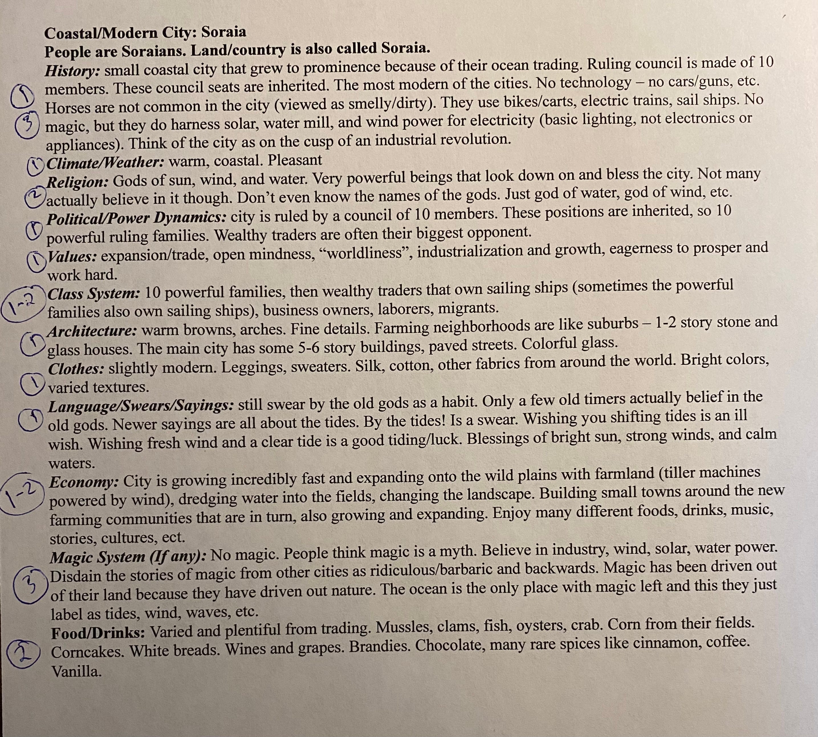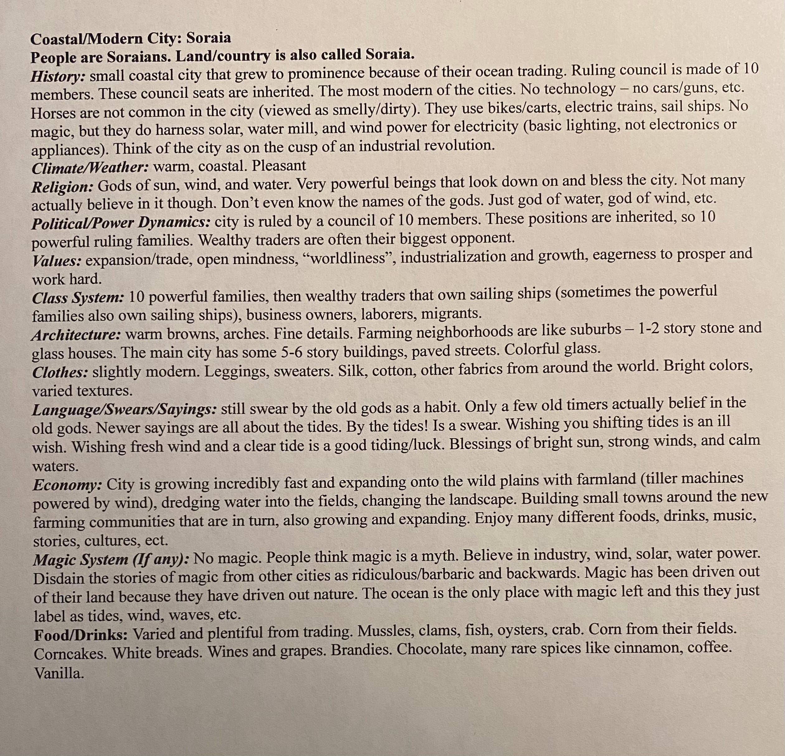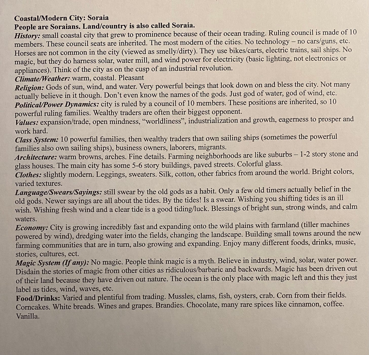 3. Building off the map, I then make a one-page sheet for each city or location I plan to use in my world. This includes a brief history, climate, religion, political system, values, class system, architecture, clothes, language/swears/sayings, economy, and food/drinks for each location. Once again, for a fantasy in which I am building a whole new world, this is pretty detailed. For an urban fantasy based in, say, Milwaukee, I just touch on a few highlights about the city. Not everything I write down will make it into the story, but it helps to make these places come alive for me so the writing is easier.