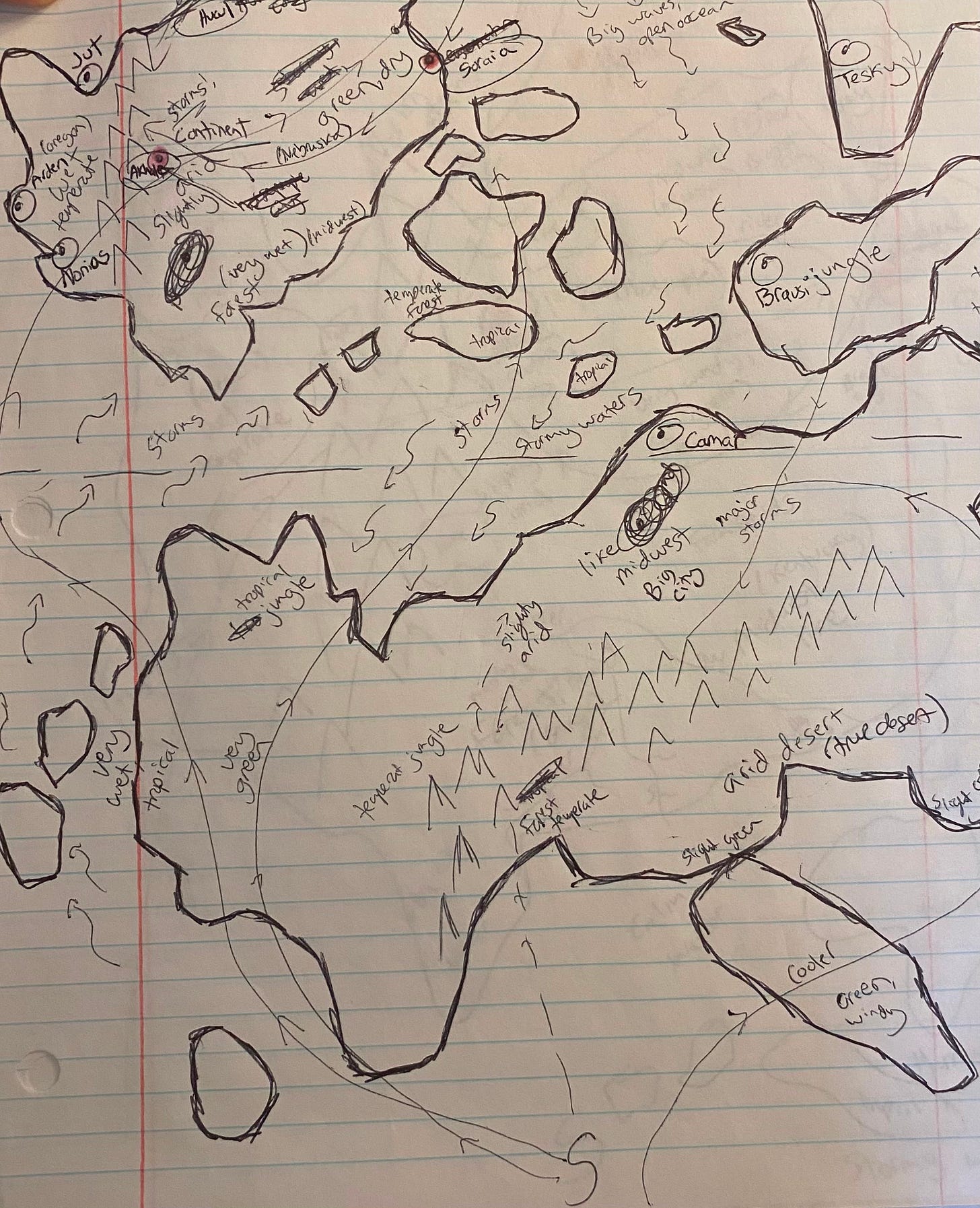 2. Then, I build the world. If fictional, I will draw a map of the entire world I am creating and label key cities, topography, etc. (I highly recommend listening to N.K. Jemisin’s MasterClass on world building!) When building a world, I think about languages and sayings, clothing, food, customs and more based on the climate and location of my story. For my urban fantasies, I don’t usually draw a map, but I will drive around the location (if I can) or research online details about the place to use in my story.