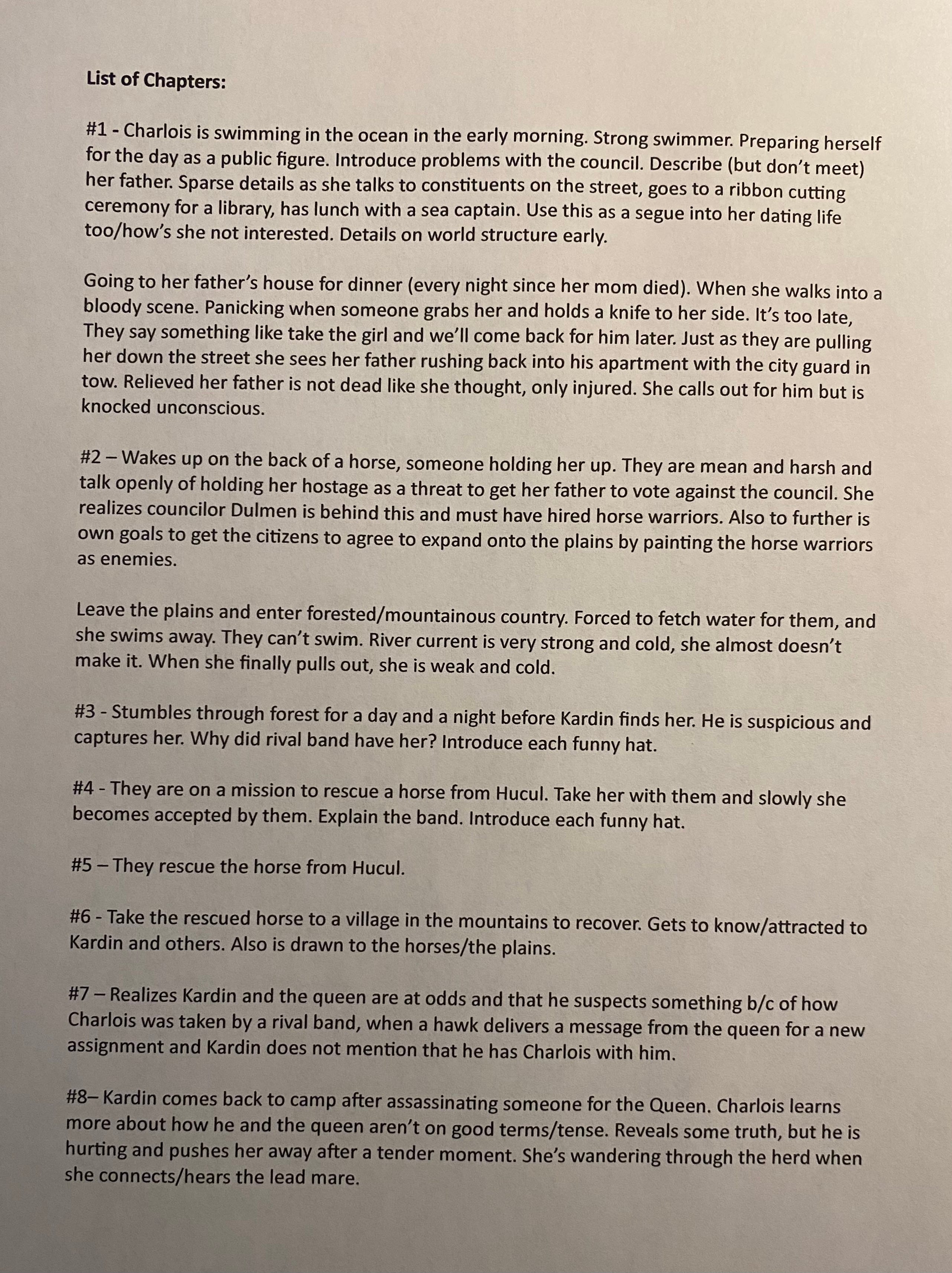 For example, take Chapter #1 in the example above. This is the plot point and what I need to make happen. I then go through my list of notes and write “#1” next to any detail I think might be helpful to give me background while writing this chapter, or something I need to include in this chapter. (Sometimes, it’s nice to know the details, even if I don’t always have to write the details). Either way, I include any and all information I think I might need that is relevant to this chapter.