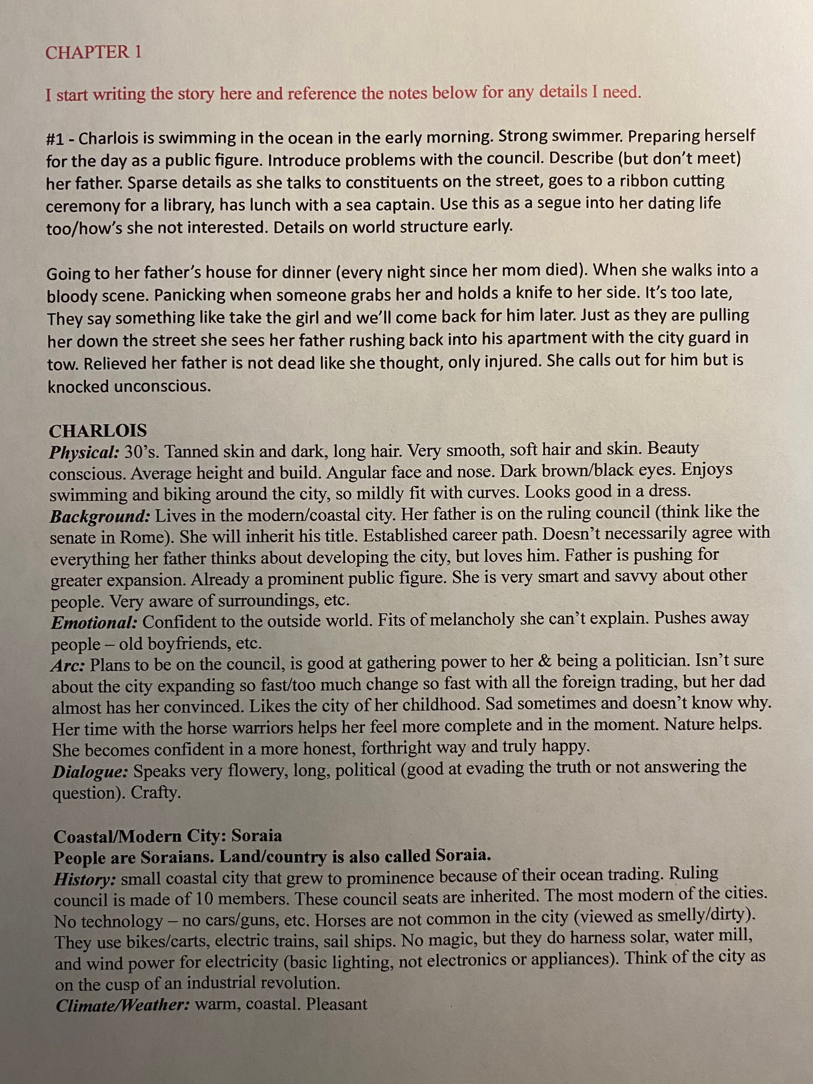 (Note: I like to copy and paste all my numbered notes for each chapter below where I’m writing on the same document so I can delete each note once I have incorporated it (almost like a checklist) and still have the original notes and details on printed sheets separately if I need. This also makes it easier to write without having to rifle through stacks of paper all the time.)